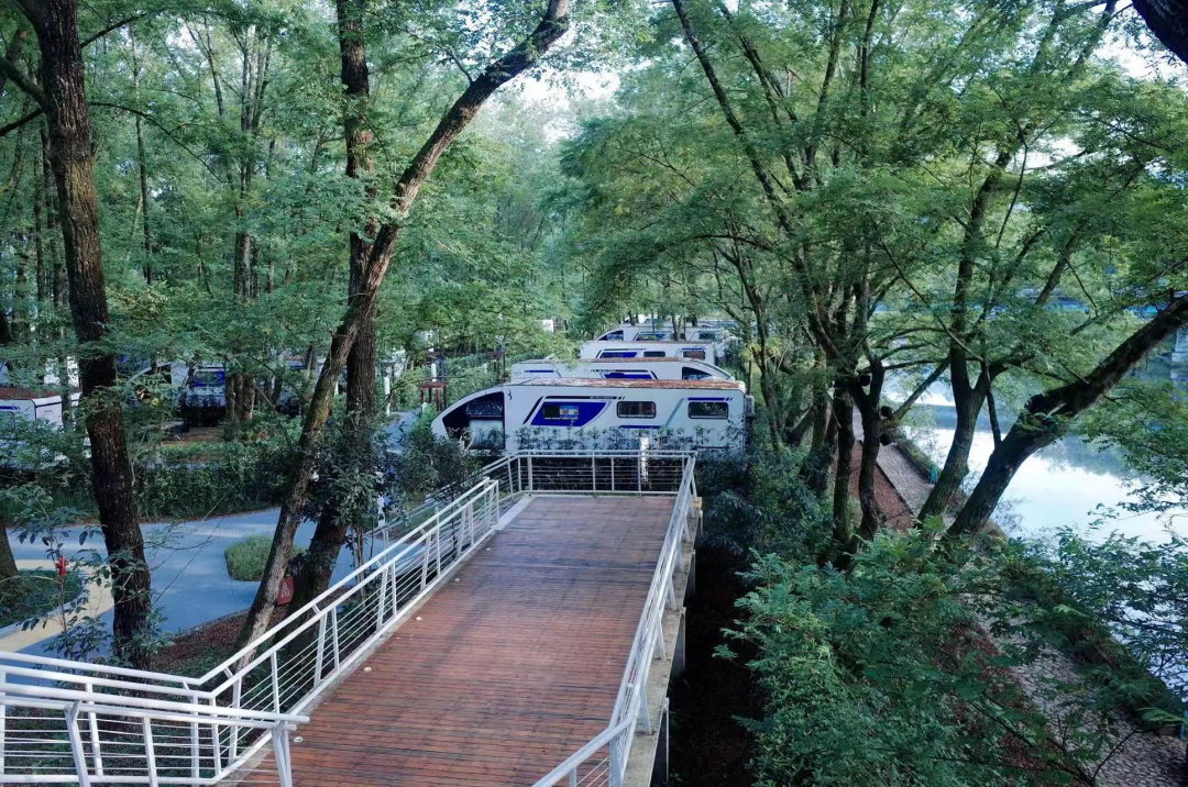 营地内部的自然资源由山林、生态停车、自然河岸等组成。总建筑面积约60000㎡,现拥有房车45辆,其中拥有10辆家庭房车及35辆新款双卧房车,其中包含组团庭院房车3组,其他均为独立带庭院房车。