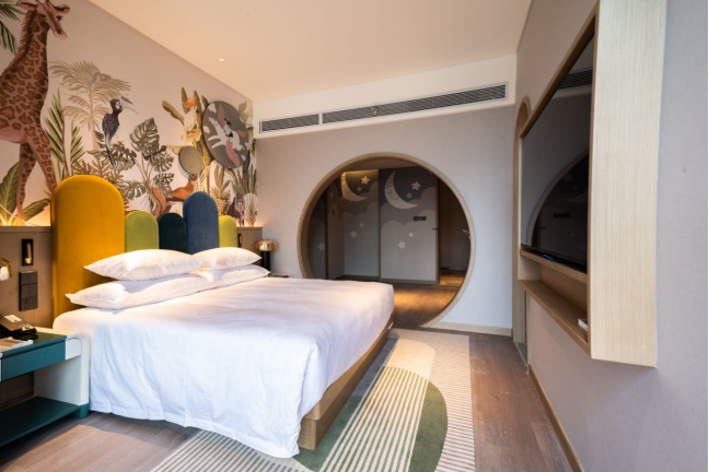 酒店设计整体采用现代风,儿童房以其中38间儿童房以森林、沙滩、星空等为主题,搭配趣味滑梯、露营帐篷、独立浴池,布局巧妙,呈现一种精心设计过的童趣感。