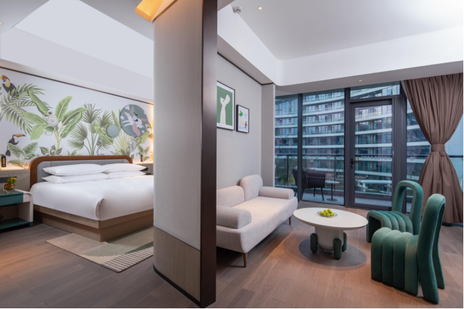 高级园景亲子房共有3间,房间面积为35平米,配有1.8米大床与泡池。室内有共儿童娱乐的专门区域,主卧配有主题背景墙,两相交错,营造出温馨的亲子氛围。外加全景式超宽视野落地窗搭配观景阳台,自然悠闲。