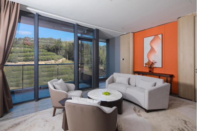 行政山景套房共有13间,配有2米大床。房间从整体布局到客房用品,都为携家人出游做了贴心准备,房间配有宽敞的客厅,小型办公桌以及舒适的纺织家具。客厅、卧室以及卫生间做了很好的切分,又创造了洄游动线,加之简约挂画,各部分空间相互串联。整体轻松的暖色格调,阳光透过全景式落地窗,将室内和室外空间连为一体,放眼便是一片绿意。