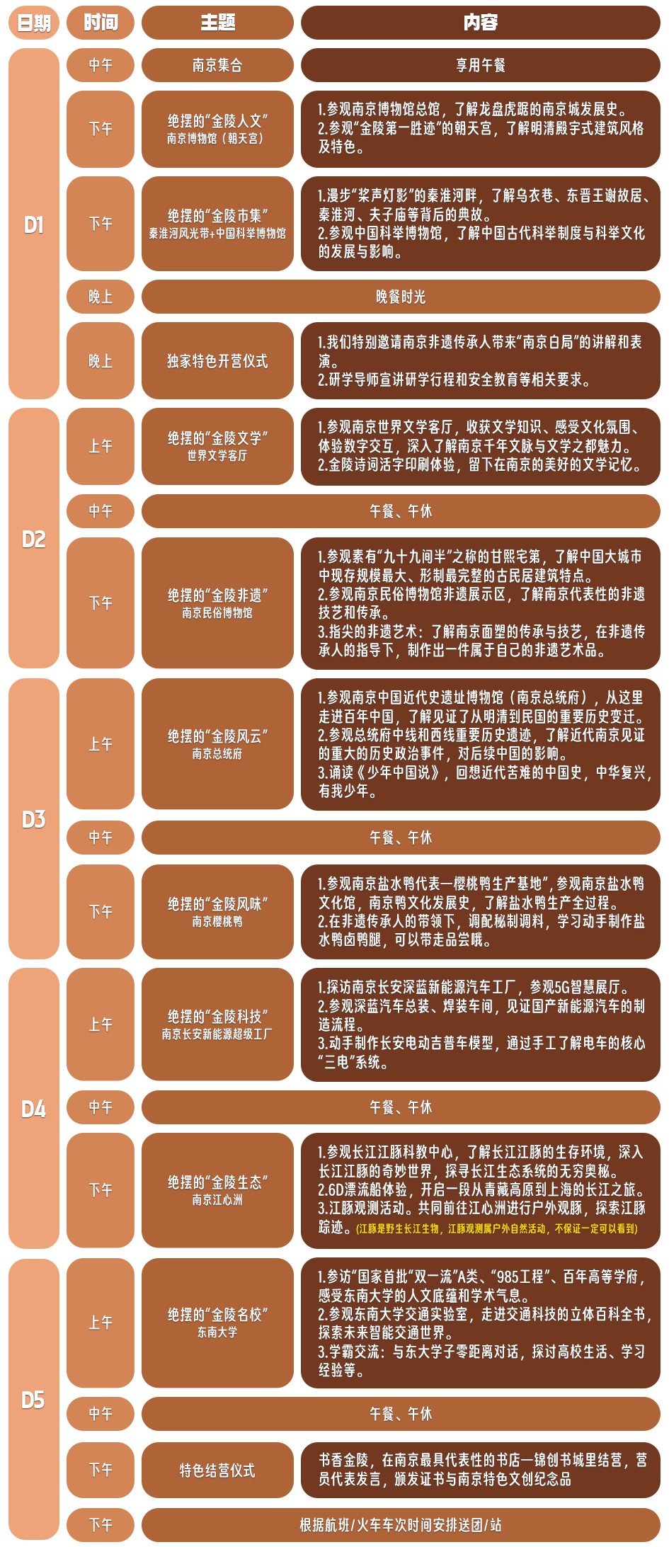 当地正规旅游巴士服务、课程活动费用,场地费用、9顿正餐(餐标社会餐40元/人、高校内30元/人)、活动物料、4晚南京基地住宿(含早餐)、专业研学导师、旅行社责任险+5日研学意外险(保额20万)