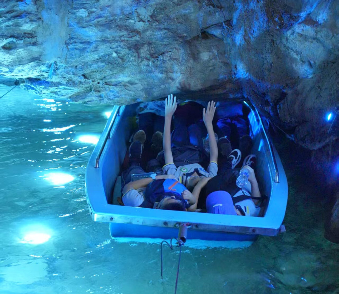 小船仅容两人平躺,随着船桨轻划,缓缓驶入狭窄的洞口,岩壁擦着鼻尖而过,孩子们屏住呼吸,又忍不住小声惊叹:“和课本里写的一模一样!”