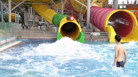 三大组合滑道齐上阵,尖叫到飞起,坐着皮筏穿过管道下滑冲入水池,溅起巨大的水花。